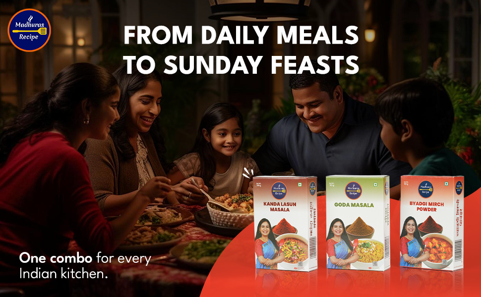 Bring home the essence of a true Maharashtrian kitchen with Madhura’s Recipe Premium Combo Pack — a perfect trio of Kanda Lasun Masala, Goda Masala, and Byadgi Mirch Powder, crafted just the way I make them in my own kitchen.