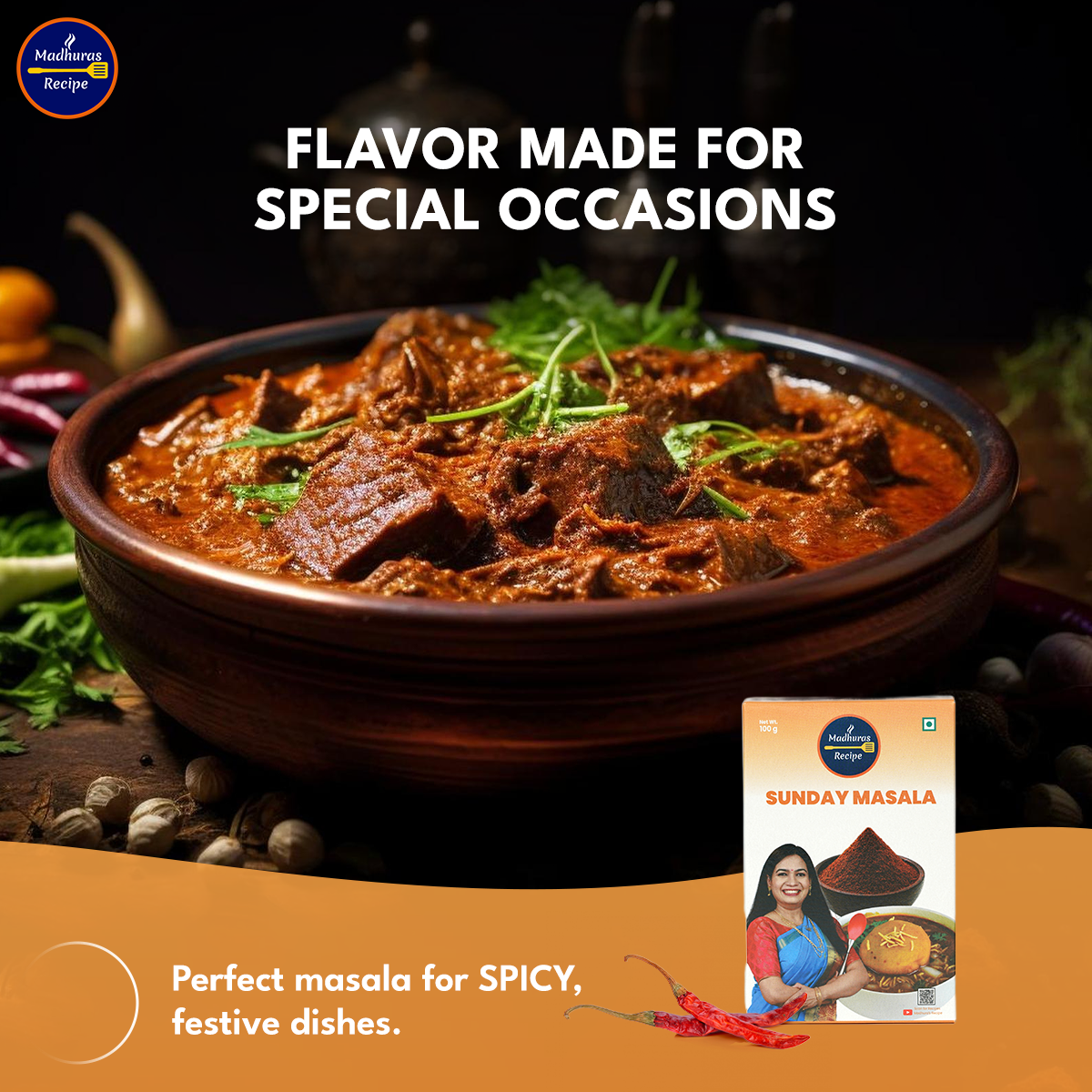 That’s why I’ve created Madhura’s Recipe Premium Sunday Masala—a bold, flavour-packed mix of roasted spices, Byadgi chilies, black pepper, coriander, cinnamon, and coconut. This masala is specially designed to make your Sunday feasts memorable.